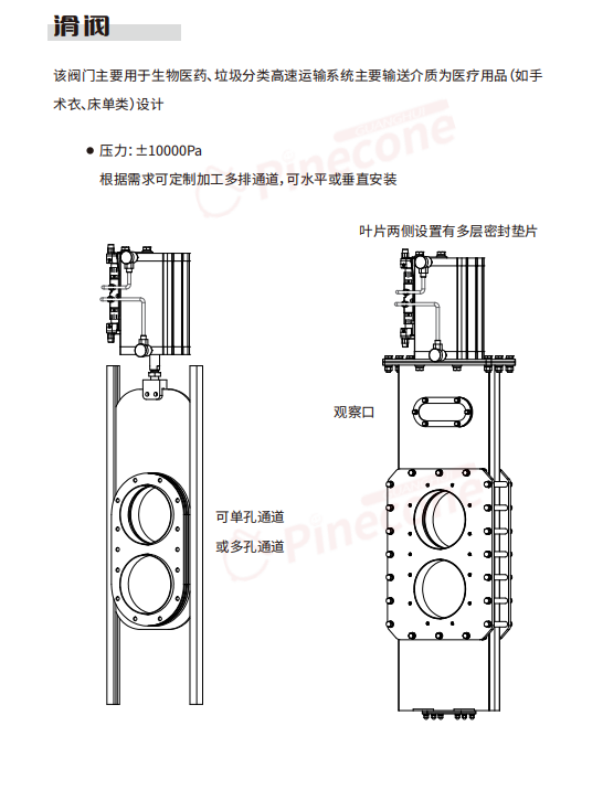 This valve is mainly used in biopharmaceutical and waste classification high-speed conveying systems, and the main conveying medium is medical supplies (such as surgical gowns, bed sheets, etc.)